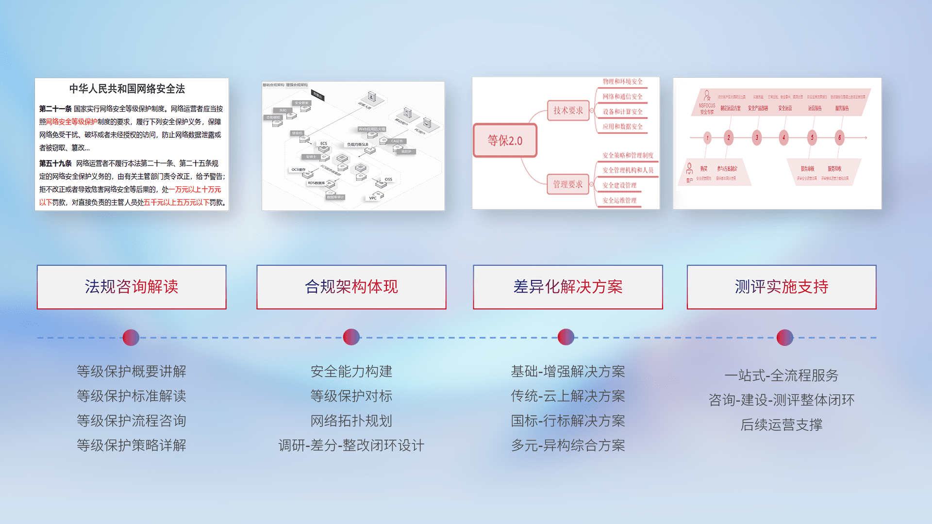 通过专业的法律咨询解读、、合规架构体现、、、差异化解决方案、、测试实施支持等服务,,,为客户量身打造等保合规体系。。。